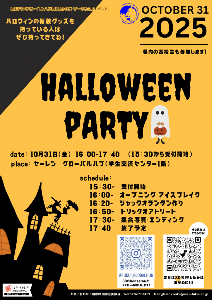 西洋の伝統行事であるハロウィンをテーマに、仮装やゲーム、クイズなどを通じて、ハロウィンの雰囲気を楽しみながら、日本人学生と留学生が気軽に交流できるイベントを開催します!
