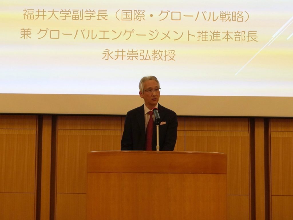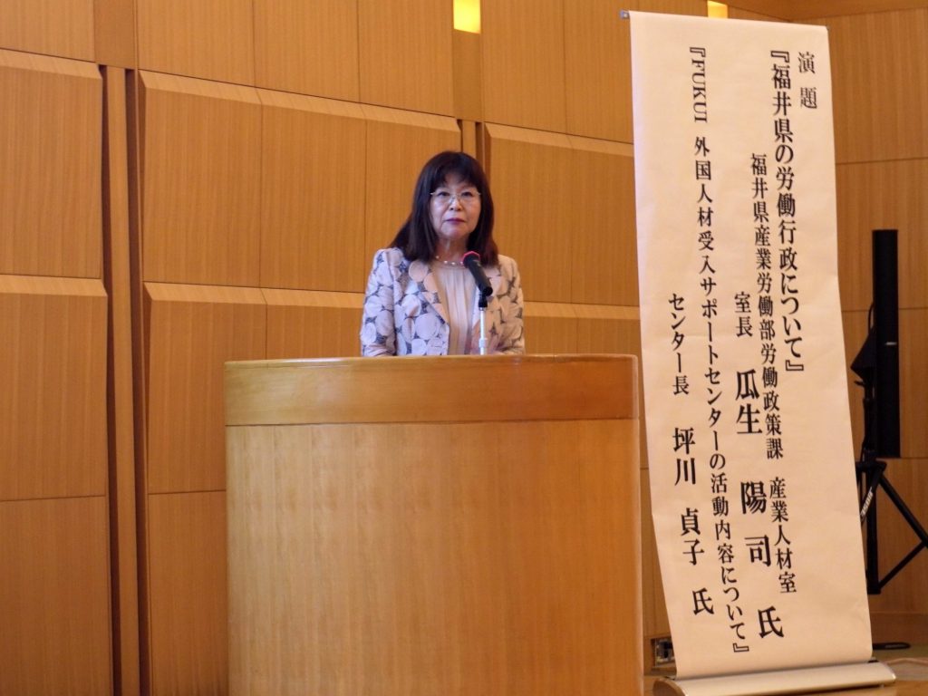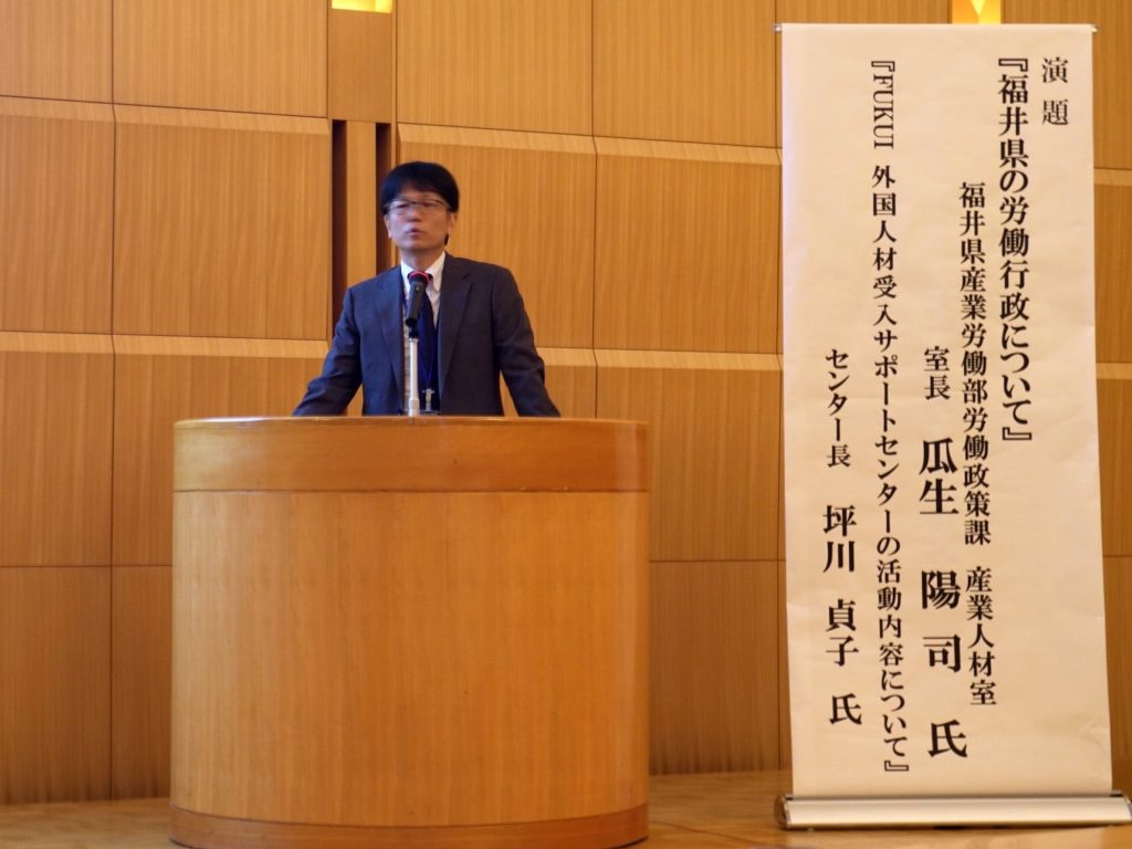 永井崇弘副学長(国際・グローバル戦略担当)の開会挨拶後、福井県産業労働部労働政策課産業人材室の瓜生室長より『福井県の労働行政について』、続けて、FUKUI外国人材受入サポートセンターの坪川センター長より『FUKUI外国人材受入サポートセンターの活動内容について』のご報告をいただきました。