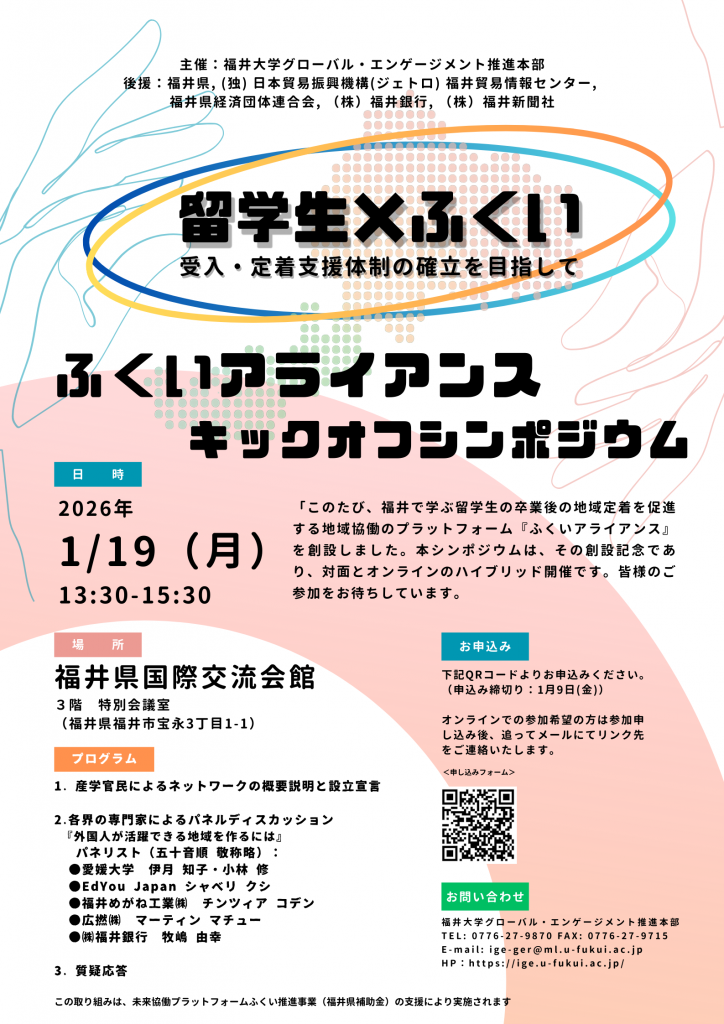 このたび、福井で学ぶ留学生の卒業後の地域定着を促進する地域協働のプラットフォーム『ふくいアライアンス』を創設しました。本シンポジウムは、その創設記念であり、対面とオンラインのハイブリッド開催です。