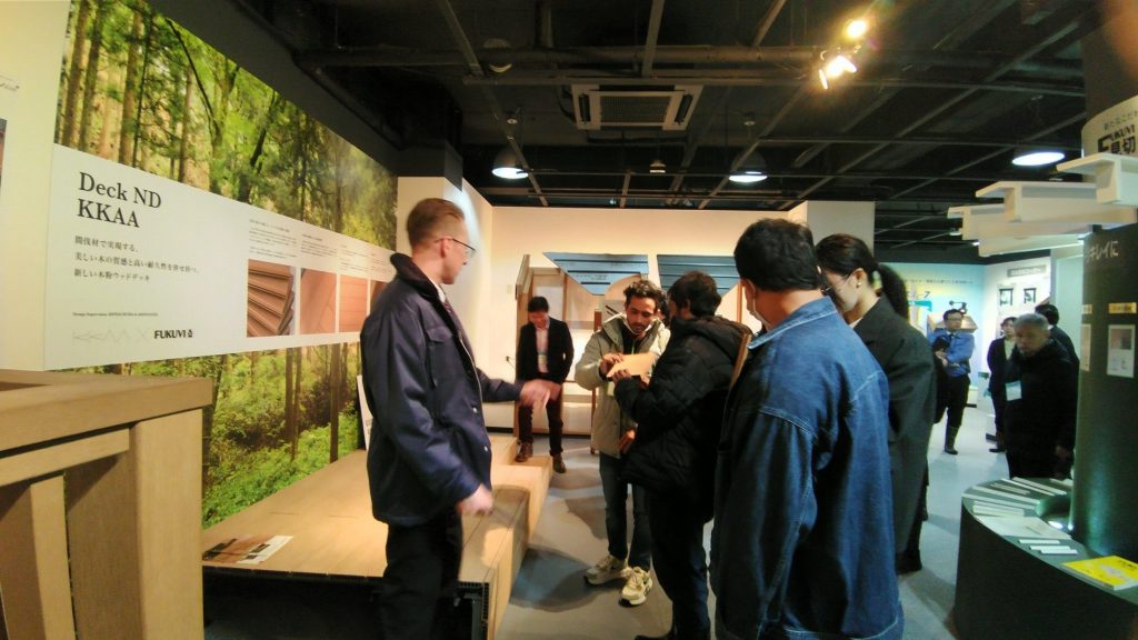 まず訪問したフクビ化学工業株式会社では、担当職員の方々に温かく出迎えていただき、企業説明と施設見学を行いました。グローバル営業推進課主任のアレクサンダー・カーペチェンコ様からは、取り扱い製品について一点一点英語で丁寧にご解説いただき、学生たちは深い関心を寄せ、熱心に耳を傾けていました。