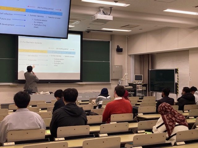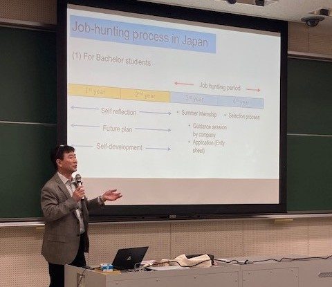 日本でのキャリア形成を支援するためのガイダンスも実施されました。「Job-hunting process in Japan」と題されたセッションでは、日本の就職活動のスケジュールや特徴について詳細な説明が行われました。 グローバル・ エンゲージメント推進本部 アライアンス戦略部長 島田和久教授からは、学部生(Bachelor students)に向けて、 各年次で準備すべき内容について説明がありました。