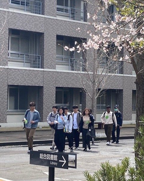 オリエンテーション期間中にはキャンパスツアーが行われました。学生たちはグループに分かれ、「総合図書館 (Library)」、「カフェテリア」など学生生活で頻繁に利用することになる学内の施設や春のキャンパスをめぐり ました。